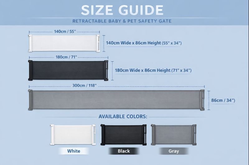 Our extra long baby gate can be installed on stairs, doorways, top and bottom of corridors, indoor and outdoor. Retractable doors with a double locking mechanism can be used as baby gate and pet gate, providing a safe, enclosed play environment. Available in all sizes as 140cm wide-86cm & above.